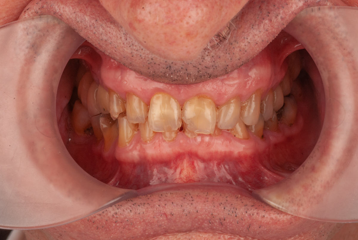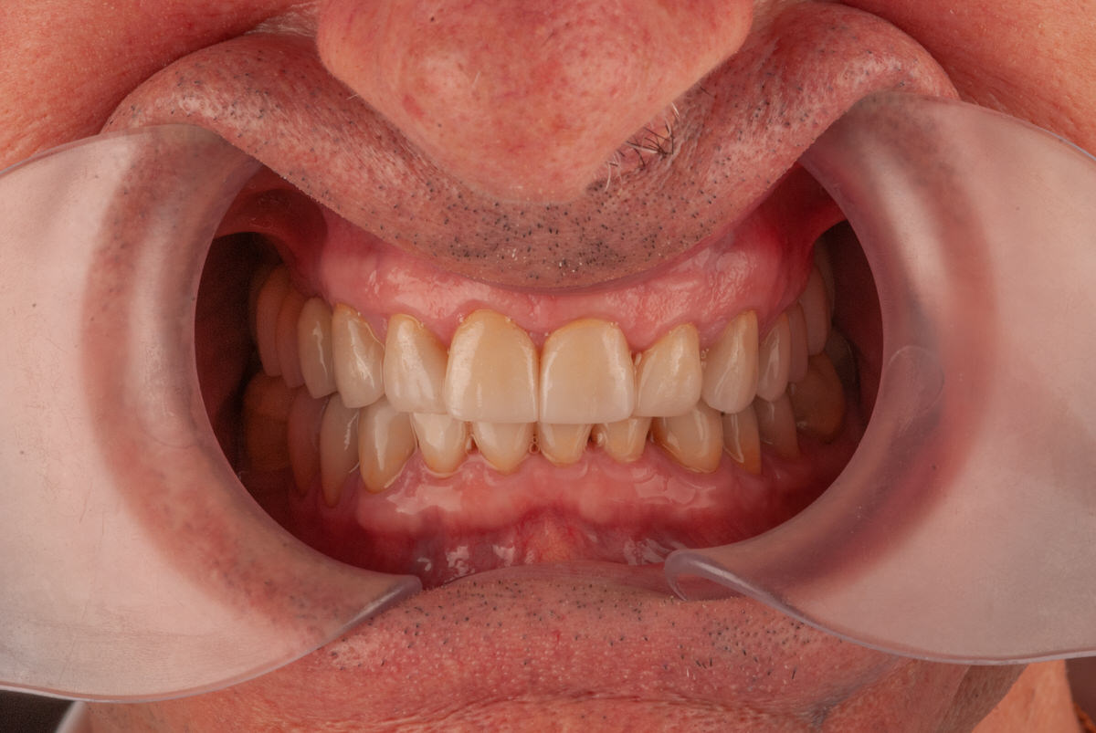 La dificultad principal en este caso radicaba en que el paciente, al ser capaz de desgastar su propio esmalte, también podría dañar cualquier restauración dental. Por lo tanto, no podíamos simplemente reparar los dientes más desgastados; era necesario rehabilitar tanto los dientes superiores como los inferiores.