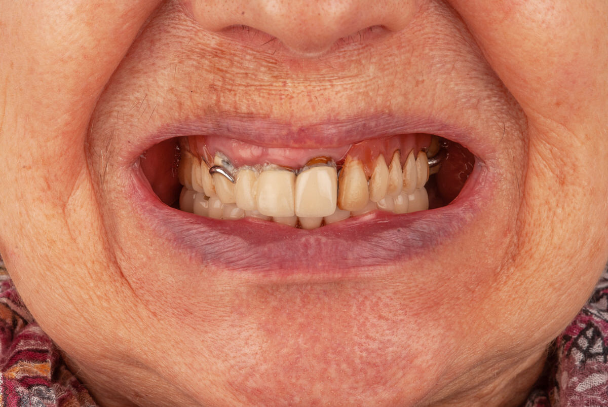 Loli llegó a nuestra consulta insatisfecha con su prótesis dental. Tenía coronas cerámicas en algunos dientes y un aparato esquelético de quita y pon con ganchos metálicos que le hacían sentir incómoda al sonreír. Loli expresaba constantemente su inseguridad sobre cómo se veían los ganchos metálicos, describiéndolos como algo que hacía que su boca pareciera sucia y poco ajustada.